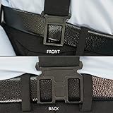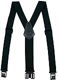 Gently hook your belt it will always work Traditional Y-back suspenders.Sturdy leather synthetic patch and adjustable elastic suspenders provide strong support. Men and women suspenders front width 1.5 inches,back width 2 inches. Heavy duty belt clip suspenders fit 5'0-6'3". Airport friendly suspender,plastic hook end,elegant through security check.