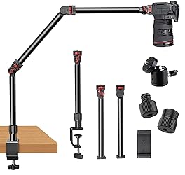- Overhead Camera Mount Suitable for Different Devices The overhead camera arm desk mount comes with a standard 1/4", 3/8" and 5/8" screw adapter for different microphones and shock mounts. Webcam arm fits For Camera, Webcam, Projector, Gopro, Phone mount, Ring light, Fill light etc. Overhead Camera Stand C-clamp Mount, Larger Clamping Distance 0-2.4in clip spacing, Suitable for most desktops on the market. The C-shaped bottom clip is glued to the top and bottom of the padded, Which can protect the desktop and increase friction, The clamp is tighter and it is easy to disassemble. Premium aluminum alloy material and adjustable design for durability and portability. Perfect for broadcast live, Online teaching or learning, Zoom business meeting, Facetime and video recording, YouTube, Baking, Vlogging. Comes with phone mount, fit for most phones. Whether you prefer live-stream on your phone or with webcam. The phone mount has 1/4" screw hole, You can also use it on your own 1/4" screw tripods.