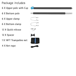 Trampoline Net is Made of premium PE(polyethylene), reinforced with triple stitched. Tightly Woven Mesh for Increased Durability. Safety buckles on the zipper to prevent it from accidentally open. Trampoline Enclosure Pole is made of rust-resistant galvanized steel, fits for trampoline leg up to 1.5inches. Foam wrapped poles strengthen the impact protection to prevent kids from being injured while jumping on it. How to Chose - First, identify your trampoline enclosure type, then measure your frame diameter, and finally count the number of poles or arches your enclosure system utilizes. Only fit for 14FT Trampoline with 6 poles Six Trampoline Pole Cap can help attach net with enclosure poles and prevent Safety Net Straps from sliding down pole. Package includes: 14FT Trampoline Enclosure Net, 6 X Upper Poles, 6 X Bottom Poles, 6 X Trampoline Pole Caps, 12 X Trampolines Enclosure Foam, 4 X Trampoline Net Rope, 12 X Quick Release, 12 X Clamp, 12 X Spacer.