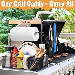 - Organize your grilling essentials with the HULISEN Grill Caddy. Featuring a large compact storage with 7 compartments, it holds utensils, spices, condiments and more. The built-in paper towel holder and utensil hooks add convenience. The smooth wooden handle ensures easy carrying for tailgating, camping, picnic and backyard parties. Metal mesh construction allows for quick cleanup, while the heavy-duty steel design withstands windy conditions. Easy to assemble and store, this caddy is perfect for BBQ enthusiasts and makes a great gift for family and friends.