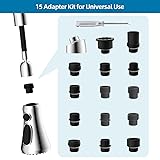 Almost Universal: Come with 15 adapters compatible with American Standard faucet, AquaSourse, Kohler, Hansgrohe, Grohe, Moen, Delta, Pfister and almost all types of faucet 3 Function Kitchen Sink Sprayer: Includes 3 water modes: stream/spray/flushing; Flushing mode is with very strong power, can easily flush the food debris; Easily switch among 3 modes through 2 buttons (the round button is for flushing). 15 Faucet Adapters Kit: Package with totally 15 adapters, compatible with most major brand faucet, easily choose one to fit your faucet according to our manual Great Quality: This kitchen sink sprayer is made of engineering grade ABS plastic with chrome finish, ensuring quality and longevity; Silicone nozzles, easy to clean, good anti- rust; No leaking to save much water and energy Easy to Install: Without any tool, take minutes, simply unscrew your old faucet head and replace it with the new one is done well; It is also a multi-mesh aerator, no-splash and can fliter out most impurities
