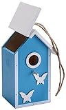 - Brighten your garden while providing a cozy shelter for backyard birds with the Butterfly Skies Bird House, Blue. This decorative wooden birdhouse features soft sky blue walls accented by crisp white trim and playful butterfly silhouettes, creating a delightful and eye-catching addition to your outdoor décor. The 1" diameter entry hole is perfectly sized for small songbirds such as wrens, chickadees, and nuthatches, offering them a safe nesting spot away from larger birds and predators. An attached rope hanger makes it simple to hang the birdhouse from tree branches, shepherd hooks, or pergolas, while the hinged roof lifts easily for convenient nest inspections and cleaning. Built from sustainably sourced wood, this birdhouse is both durable and eco-friendly, ensuring many seasons of reliable use. Measuring 5"W x 4.25"D x 7.125"H, it’s the perfect size for smaller birds while remaining a charming decorative accent for your backyard or patio. Add charm and function to your outdoor space while supporting local wildlife with the Butterfly Skies Bird House. Opening: 1" dia. Dimensions: 5"W x 4.25"D x 7.125"H Mounting: Hanging with rope loop Construction: Wood