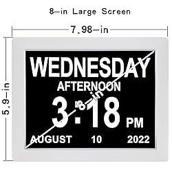 - Digital Calendar Day Date Time Clock for Seniors Elderly Perfect for Senior Easy to Use and Operation Extra Large and Clear Hourly Chime.Digital Day of the Week Clock for seniors, elderly with dementia, Memory Loss, Alzheimer is a wonderful festival or birthday gift. Memory loss calendar day clock displays week, month, date and cycles of a day. Each period has no confusing abbreviation letters to remind you, which helps the Alzheimer distinguish day and night and helps others manage their time effectively. More features:★ Adjustable Alarm Volume & Brightness Change at day and night Time Mode: 12 hours or 24 hours Show Time of: Day, Week, Month, Year Dual Date Mode: Month-Day-Year or Day-Month-Year. ★ Displays: MORNING AFTERNOON EVENING NIGHT BEFORE DAWN.★ 8 Languages: English, French,Germany, Italian, Dutch, Spanish, Polish, and Swedish.★ 5 Alarms Options 3 alarms for reminder to take medicine Morning medication reminder, Afternoon medication reminder, Evening medication reminder. Choice of 3 alarm modes separately: Off, Once, Repeat(Every day). ★ Package Contents: 1 x Digital Calendar Clock 1 x Adapter 1 x Holder 1 x English User Manual.