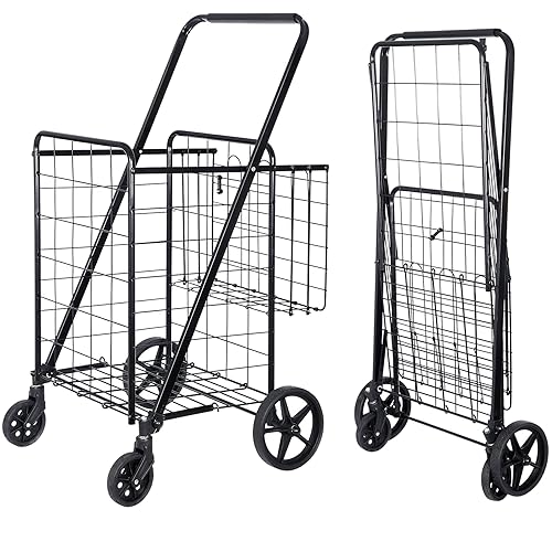 【SUPER HUGE LOADING CAPACITY & JUMBO SIZE】Our foldable shopping cart made by high quality low-carbon stainless steel,the wider steel and stable fame structure makes you can easily carry 450 pounds. It is widened size and large enough to carry all the groceries at one time. The front large basket size is 19.5 * 15.3 * 22.44 inch ,the extra back basket size is 19.5 * 5.7 * 13.7 inch 【UPGRADE MESH BOTTOM & WIDER STEEL FRAME】The wire mesh bottom and reinforced bar allows you to carry a lot of weight and it does not bend! The wider steel construction and thick handle bar makes it handle the heavy duty groceries pretty well.It's comfortable and not cold in winter to touch the padded handle. 【BIGGER RUBBER WHEELS & EASY TO MANEUVER】The upgrade 360° swiveling front wheels make it super easy to maneuver around corners and into tight spaces.The oversized strong back rubber wheels are helpful to resist wear and noisy.It moves, glides and spins with ease on sidewalk or rough surface.so you can protect your joints and haul your stuff nicelyto condo,laundry or post office 【EASY TO ASSEMBLE & FOLDABLE DESIGN】Our grocery cart on wheels also folds flat effortlessly,stays closed with the latch, and takes up very little space in the car. The assemble is a breeze-all the appropriate tools and accessories were included.You can finished the assembly within 3 minutes according to our instruction 【WHAT YOU WILL GET】You will get one jumbo shopping cart frame,two front wheels,two rear wheels, one english manual, one waterproof liner and one box of assembly parts. 【TIPS】Please check the size of the two baskets before purchasing to avoid purchasing mistakes