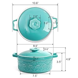 𝐏lease note that this baking dish cannot be used on open flames or induction cooktops, as uneven heating and sudden temperature changes can cause the ceramic to crack. Elsjoy 2 quart vintage embossed casserole dish measures 10.5"D x 4.7"H (lidded). This 2-quart ceramic casserole dish combines vintage charm with modern functionality for everyday cooking. The durable construction ensures reliable performance through years of regular use in any kitchen. 𝐏remium 𝐂eramic: Crafted from premium glazed ceramic that distributes heat evenly for perfect cooking results every time. The lead-free material resists stains and odors while being completely food-safe. Dishwasher, microwave, and oven-safe design makes cleaning and reheating effortlessly convenient. 𝐏ractical 𝐃esign: Featuring an easy-to handle lid and practical size, it's perfectly designed for family meals and special occasions alike. Side handles are ergonomically designed to fit comfortably in the hand, making it a breeze to lift and transport from kitchen to dining table. 𝐄legant 𝐀ppearance: Beautiful turquoise glaze with delicate lace patterning creates a charming vintage aesthetic. Decorative flower-shaped knob on the lid adds a touch of classic elegance to the design. The timeless styling looks equally beautiful during cooking and when served directly at the table.