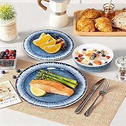 [Care Instructions] Top rack dishwasher safe (max 70°C/158°F). Avoid high-heat cycles and intensive wash programs. Not microwave or oven safe. [Special Design] An adorable set of dinnerware will highlight a dinner. Our set is designed with blue ice-cracking textured surfaces, calm, relaxed and elegant and it perfectly matches most table settings. Also, it won’t steal the attraction of delicious food but add some extra beauty to them. Your must-have dinnerware for the coming summer parties. [Premium Quality] Our melamine dinner set is durable. It is made of BPA free materials, shatter-proof, chip-resistant and scratch-proof. You won’t worry if they will break easily when it falls down accidentally, help you to save more for purchasing more sets. Best choice for families. [Dinnerware Sets for 4] 12 pieces melamine dinnerware set including 4 x 11" dinner plates, 4 x 8.5" salad plates, 4 x 7" bowls. Perfect to serve a family of 4. [Practical and Versatile] Ideal for home kitchen use, family gatherings, family camping, a picnic and recreational vehicles. It is also a wonderful gift choice for housewarming and weddings.