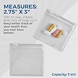 REUSABLE ZIPPERED DESIGN: Instead of carrying multiple medicine bottles everywhere, you could bring them in our Zippered Pill Pouches. These resealable clear pouches allow you to store pills, tablets, capsules, fish oils, and more. Never miss out on your daily dosage again. LARGE SIZE: 2.75" X 3” Each self-sealing pouch measures 2.75" x 3" and each bag is 7 mils thick. Conveniently store safely and securely several of your medication, vitamins, and supplements in just one pouch. These easily fit in your pocket, purses, and bags or stay more organized at home and easily arrange in baskets, boxes, or trays inside drawers or cabinets. PACK OF 12 ZIPPERED PILL POUCH BAGS: Every order includes 12 pieces to provide you with more than enough for prepping your daily or weekly scheduled medications. Use your remaining pouches for organizing and storing jewelry, crafts, beads, collectables, and other small items to preventing clutter in your home or office. HEAVY DUTY. PREMIUM QUALITY: Made of BPA-Free Food Grade EVA material, which is thicker yet lightweight, more flexible, and stronger than regular zippered bags, MEDca pill pouches are reusable and won't tear or break easily. The sliding lock seals the opening securely making them spill, water, and leak-proof thus prevents scattering and protecting the contents inside GREAT FOR STORING SMALL ITEMS: Ideal for medication, our sliding lock mini bags are also suitable for storing other items like jewelry, trinkets, screws, pins, clips, craft items, kids’ toys, and more. You can also use them for food items like candies, gummies, and other snacks.