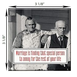 OLD COUPLE BY WRIGHT HOME & GIFT (MAG004) – Fridge magnet with funny quote: Marriage is finding that special person to annoy for the rest of your life WITTY QUIPS FOR YOU FRIDGE – This signature design features quirky and unique art, quips and quotes that will bring a smile to any face. Display your humor, front and center in your kitchen with this unique and quality refrigerator magnet. STRONGEST HOLD FOR MORE STICKING POWER – Each magnet can hold 4 photos or 6-7 pieces of A4 paper to the fridge surface firmly and effectively, it will not let papers fall. You can leave messages to your family and add a splash of style to your kitchen. LARGE, THICK & SOLID 3x3 MAGNET – You'll love our uniquely strong and durable, heavy duty magnets. They won’t bend, peel or fade. Each durable magnet features a high-gloss weather resistant finish and full color original art. DESIGNED AND PRODUCED IN THE USA – Wright Home & Gift founder and creator Tim Wright is a regular at small town flea markets, barn sales and creaky floor board antique shops, hunting down one-of-a-kind visions of the past. His designs are homegrown in the Pacific Northwest. Made in America is how we do things!