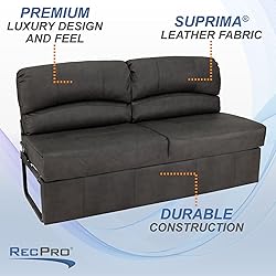 Space-Saving Design: Requires only 3 inches of wall clearance when upright, making it ideal for RVs, campers, or small living areas. Easily converts from sofa to bed for maximum functionality. Perfect Fit for Your RV: Overall dimensions: 72 ¾"W x 34"H x 28"D. Bed dimensions: 72"W x 19"H x 42"D. Includes 11" clearance under couch for added storage space and optional legs for custom installation. Durable Construction: Crafted with a heavy-duty all-metal frame for lasting support. Upholstered in Suprima Soft-Touch Leather, engineered for durability and comfort with a 200,000 double rub Wyzenbeek rating and 5-year hydrolysis protection. Stylish Color Options: Available in Putty, Mahogany, Chestnut, Gunmetal, and Toffee to complement any RV interior.