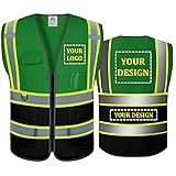 BeautyWill Custom Safety Vest Customized Logo Mesh Vest Class2 High Visibility Reflective Vest with Pockets Workwear(Green Black,L )