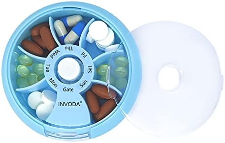 INVODA Weekly Pill Organizer 7 Compartment Rotating Pill Box for Daily Medication & Vitamins - Portable Travel Pill Case Fish Oil Supplements Vitamins Organizer (Blue+Bag)