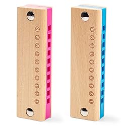 BEGINNER FRIENDLY - There are 10 holes on our harmonica with corresponding numbers 1-10, which are suitable for beginners and children, easy to learn. Our kid harmonicas can stimulate children's musical talent and develop artistic potential. The harmonica has a pleasant sound, good intonation, and pure tone quality. PREMIUM & NATURAL WOOD - Our kid harmonicas are made of beech wood, non-toxic and odorless, solid and durable, not easy to corrode, smooth and burr-free, easy to wipe and clean. COMPACT- Our wooden harmonica size is 4 x 1inches, lightweight and compact, suitable for kids to grip, portable, easy to play at any time and any place. WIDE APPLICATIONS- Our kid harmonicas are suitable for music themed parties, instrument themed parties, birthday gifts, holiday gifts, gift bag fillers, etc., and suited as educational tools for class, harmonica training tools for children. YOU WILL GET- 2pcs kid harmonicas in 2 different colors, blue and pink, which are must-have instrument supplies for children to learn.