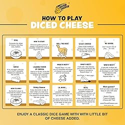 Family Game Night: Diced Cheese offers an exciting and addictively fun dice game that accommodates 1-6 players, making it an ideal choice for solo play or family game night. Easy to Play: This game is designed for fast-paced entertainment, typically taking only 15-20 minutes to complete. It ensures that you can have a fun family game experience without long sessions. Unique Dice Games: Dive into the game's unique theme, navigate the intriguing waters of NO GOUDAs and LEANING TOWERS OF CHEESA's. Add an extra layer of fun and surprise to your gaming sessions. Simple Fun Games: You can engage in spirited competitions with friends and family without the need for complex calculations, pencils, or scorecards. Accessible to players of all individuals aged 15 years or older,and skill levels. Portable and Convenient: Allows you to take it anywhere, travel games for a camping trip, a bike ride, or just a casual outing. Keep it in your backpack, bike pouch, glove box, purse, or back pocket.