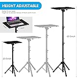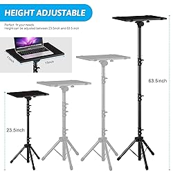 【Upgraded Protection Device】: Projector Stands add a safety latch, which avoids the danger of falling. Laptop tripod is made of thickened aluminum metal to ensure overall stability. Metal top tray prevents warping in the transportation process. 【Simple Installation & Stable】: It may take you 5-10 min to install according to attached accessories and instructions manual(No extra tool to set up). Before using the projector tripod, tighten the lock for each connection to ensure more stability. 【Multifunctional Scenes】: The enlarged top tray(15" x 11") supports various sized devices, such as projectors, laptops, music players, and DJ equipment. This tripod stand is suitable for home party, conference, speech, report, DJ, office. 【Widely Adjustable Height & Tilt】: The projector tripod stand is easily adjusted from 23.5 to 63.5 inches for height to meet personal needs. The top tray can be easily tilted within a range of 180° to provide a comfortable viewing angle. Maximum load capacity is 22 lb. 【Portable & Foldable】: Detachable design makes the projector holder easier to store and carry out.After disassembled by section, they fit perfectly into the provided bag. Sponge pads and elastic belts enhance the stability of outdoor & indoor use.