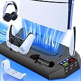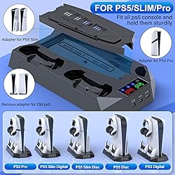 FOR PLAYSTATION 5 SLIM/PRO DIGITAL EDITION&DISC VERSION CONSOLE: The ps5 slim cooler stand vertical holds PS5 Slim/PS5 Pro /PS5 Standard both Digital and Disc edition consoles, and the ps5 cooling station with extra auxiliary fixed strip for PS5 Standard digital edition console can hold the ps5 cooling system more sturdily on the ps5 docking station with cooling fan, making your setup way nicer. It's also a must have charger station for ps5 controllers(Not for edge controllers) 2H FAST CHARGING WITH DUAL CONTROLLER CHARGER: This ps5 slim stand with cooling fan and controller charger achieves to charge 2 ps5 controllers with 1 cord plugged in playstation 5 console so only waste 1 usb port instead of both. Easy for dualsense controllers charging in one ps5 charger station at once and the LED indicators can clearly display the charging status of the ps5 controller(Red - charging; Green - fully charged or standby). The ps5 pro cooling station and charging dock will charge 2 ps5 controllers within 2h so that at least 1 hour could be saved 3 USB PORTS+3 ADJUSTABLE COOLING FAN SPEEDS: This ps5 pro ps5 slim cooling station with charger provides gamers with 3 more USB ports for ps5 console, which can be used to charge ps5 controllers, ps5 headset, ps5 HD camera and other external USB devices. The ps5 pro stand with charging station has a 3 adjustable speeds (high, mid, low) cooler fan to blow the heated air away from the bottom of the ps5 console and keep it always cooled down. The ps5 slim pro cooling fan can be turned on/off by switching the speed level 1 HEADSET STAND+1 MEDIA REMOTE HOLDER+1 METAL SCREW: A headset hanger, a media remote slot and a metal screw are coming with the ps5 cooler station. Use the metal screw to lock the ps5 console into the cooling station stand for ps5 slim/ps5 pro/ps5 console to achieve secure and stable. This ps5 charging station with cooling fan helps well organized ps5 controller accessories, ps5 headset, media remote in one place TWO POWERED WAYS FOR PS5 COOLING CHARGING STATION: The ps5 slim cooling charging stand can be powered by ps5 console and 5V/3A AC adapters, via the USB C cable. Charge the ps5 controller and cool down the ps5 slim/ps5 pro/ps5 console although the ps5 console is in rest mode. Adopted smart chip for ps5 station, the ps5 slim/pro charging stand provides ps5 controllers with over-charge, over-heat, over-voltage and short circuit protection. Package List: ps5 cooling stand x1, usb cable x1, headset holder x1