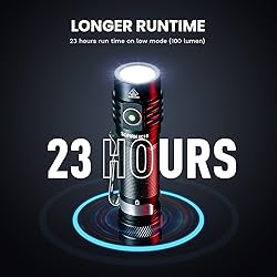 Leading Performance: This LED flashlight is equipped with 1* upgrade domeles led, 1800 Lumen max, the beam distance is throwing up to 711ft (217m). Producing a particularly soft and balanced beam profile to preserve comfortable vision. Portable: Easy to carry in a pocket with its lightweight (1.9oz) and compact Aluminum body (3.9‘’× 0.9‘’). SC18 pocket flashlight is your outdoor companion. Make sure to click 4 times to lock it when put in a backpack or pocket to avoid accidental clicks. USB C Rechargeable: Inserted a USB-C charging port,one battery included and fully charged in 1 hour through a 5A/2V charger . Approx working 6.3 hours at Medium mode(350lm), 23 hours at Low mode(100lm). 6 Modes: Access different outputs with the side e-switch for any daily use scenarios.Indicators on the side switch to get a power level reminder at a glance. It features six brightness levels: Low/ Medium/ High/ Turbo/ Moon/ Strobe. Ready to Perform: Rated at IPX8 waterproof to withstand extreme weather conditions. Our handheld flashlights are impact-resistant and feature a sturdy aluminum alloy body that can withstand a direct 3-foot drop. No worries about slipping out of hand easily with double unique knurling for unique style and solid grip.