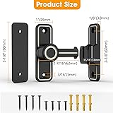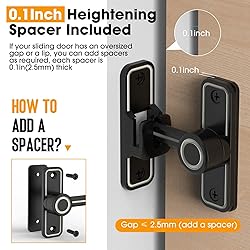 Upgraded 2-IN-1 Keyless Entry Door Lock: The 90/180 Degree barn door lock can be mounted at 90° right angles, also can be mounted at 180 degree angles for even more space-saving use. Ideal for family bedrooms, doors, bathrooms, gates, sheds, cabins, windows, cabinets, garages, kitchens, offices, barn door latchs and more Heavy Duty Material: The flip latch lock is made of zinc alloy and has a multi-layer polished surface to eliminate any corrosion, rust and discoloration, ensuring durability and reliability Comes with 2.5 mm Thick Door Latch Spacer: The spacer is made of solid aluminium alloy material; Thickness: 2.5 mm; Length: 80 mm; Width: 25 mm; If the door and the frame/wall are not in the same plane, the sliding barn door locks can be installed by adding this spacer (for example, if the door gap ≤ 2.5 mm, you can add one 2.5 mm spacer; if 2.5 mm<the door gap ≤ 5 mm, you need add two 2.5 mm spacers Extra Security for Peace of Mind: The barn door lock is a safety measure for your family, preventing unwanted entry and keeping toddlers and pets safely inside Quick to Install and Maintain: Punching holes with screws and installing flip gate latch Lock at the position mark; quality screws ensure a firmer installation Packing List: 1 * Black Barn Door Lock, 1 * 2.5 mm Spacer, 8 * Screws, 4 * Expansion Tubes