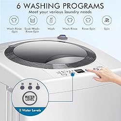 【2-in-1 Full Automatic Technology】: This full automatic washing machine can make your laundry work much easier. You just need to set the washing/spinning program and then it will work alone. The stainless steel inner tub with honeycomb design simulates the hand washing effect and prevents the clothes from getting intertwined. 【Convenient Drainage & Imbalance Adjustment】: This full automatic washing machine comes with a built-in drain pump and an extended drain hose to drain dirty water easily and effectively. Moreover, when the laundry in the tub is placed unevenly during spinning, the washing machine will detect and adjust imbalance automatically to avoid any annoying vibration. NOTE: please use a FAUCET ADAPTER or change a hose if it does not fit your faucet! 【Compact Design & Large Capacity】: This lightweight one-tub washing machine with a compact size of 17" x 17" x 29.5" (L x W x H) won't take up much floor space and is easy to move it. In addition, the large stainless steel inner tub can hold up to 8 lbs of clothes at one time, which can meet all the laundry needs of your family. 【6 Programs & 3 Water Levels】: The clear button control panel and LED display make the operation very easy for everyone. What's more, 6 laundry programs and 3 water levels offer various choices for you to deal with different kinds and amounts of clothes. The power supply will automatically shut off when the washing is finished or there is no operation in 10 mins after pressing the power button. 【User-friendly Design & Wide Application】: The transparent visible top lid makes it convenient for you to see the washing status at any time. The embedded handles on both sides help to hold and move the washer easily. This portable and full-automatic washing machine is a perfect choice for dorms, apartments, condos, RV’s, camping, etc.