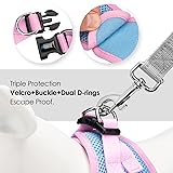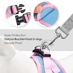 [SIZE TIPS] Please MEASURE your dog and refer to our size chart for the best fit before ordering. (Size does NOT directly correspond to your dog’s breed or weight.) [STEP-IN HARNESS] Simple and easy-to-wear. Lay the harness flat on the floor, have the dog stand with feet in the leg holes, pull the sides up and clip and off you’re ready to go. [LIGHTWEIGHT and COMFORTABLE] This vest harness is made of Oxford fabric and soft air mesh padding. It’s light enough for puppies and cats. The soft trim makes it comfortable and would never create any rub spots even on sensitive skin. [HIGHLY REFLECTIVE] The reflective bands on harness are really nice when it gets dark. It’ll let drivers have long time to react, which ensure your pet’s safety! [TRIPLE PROTECTIONS] It is secure with the Velcro, the clasp and the dual D-rings that come together to attach the leash.