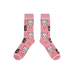 CUSTOM DESIGN: Images of Luna and Aretmis' faces and crescent moons appear across the pink background of these crew socks. Fans of the Sailor Moon Crystal anime series will love this fun custom design. ARCH COMPRESSION: These Sailor Moon Crystal crew socks come with an arch compression feature and a cushioned footbed to provide more support and keep your feet feeling comfortable through the entire day. HIGH-QUALITY MATERIALS: These Sailor Moon Crystal crew socks are made with a blend of durable, high-quality polyester and spandex materials to keep you feeling comfy and cozy while you enjoy your favorite anime series. SIZING: These Sailor Moon Crystal Luna & Artemis crew socks fit a sock size of 10-13 and a shoe size of 8-12. CARE INSTRUCTIONS: For the best care, machine wash these Sailor Moon Crystal crew socks on cold with a load of like colors and tumble dry on low heat. Do not bleach.