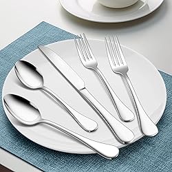 18/10 STAINLESS - Crafted of high-grade 18/10 stainless steel, 10 percent nickel gives it more luster and protection from corrosion compared to 18/0 flatware, Non-toxic and rust proof, Sturdy construction not easy to bend, Easy to clean and dishwasher safe SERVICE FOR 8 - E-far 40pcs stainless steel silverware set includes 8 Dinner Forks, 8 Dinner Spoons, 8 Dinner Knives, 8 Teaspoons and 8 Salad Forks, Basic flatware set for both daily use and special occasions, Elevates dining experience FINE WORKMANSHIP - Each flatware piece features finely polished edges including the tines on the forks, No rough spots or angles to hurt your finger and mouth, Proper weight - not too heavy or too light, Well balanced and feels comfortable in hand, Knives with serrated blade can cut meats easily TIMELESS DESIGN - Simple design with round shaped handle goes well with any style from traditional to modern, Sleek, classy curves and a shining polished finish give this utensils set an elegant look and comfortable feel, You can use them to serve food with confident and enjoyment VERSATILE SET - This complete and versatile silverware set with proper size for both adults and children, Perfect for daily home kitchen use, restaurant, hotel, Suitable for wedding, party, catering, Also as a decent gift for house warming, Christmas, Thanksgiving, Birthday, etc.