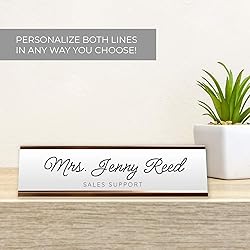 - Brighten any office or classroom with this chic and vibrant personalized name plate! This trendy 2" x 8" custom desk plate with a modern rose gold holder is a great gift for teachers, co-workers, employees or bosses. Includes two lines of customization to add a name, occupation or any text of your choice. The perfect gift for birthday, Teacher Appreciation Day, Boss's Day, or any occasion to make someone feel extra special! Proudly made in the USA. Includes: One personalized desk sign and metal holderFeatures: Convenient 2 inches by 8 inches sizeClassic black and white script designPerfect gift for co-workersBold black and white printing on durable plastic material with rose gold metal holder standMade in the USA