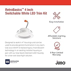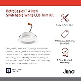 - Illuminate your home with precision and style using the Juno 4" LED Recessed Lighting Trim Kit from the RetroBasics Series. Designed to fit 4" housings, this all-in-one LED downlight offers 625 lumens of brightness and features a 5-in-1 switchable white color selection (2700K Soft White, 3000K Warm White, 3500K Neutral, 4000K Cool White, 5000K Daylight) to match your mood or decor. Its sleek matte white baffle trim reduces glare while delivering uniform, energy-efficient lighting. With easy retrofit installation and wet location safety, it’s ideal for any room from kitchens to showers. Dimmable down to 10%, this versatile ceiling light is CSA certified, built to last up to 50,000 hours, and comes backed by a 5-year warranty.