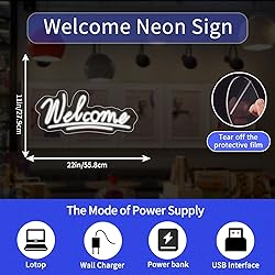 【Welcome Neon Sign】The LED lights sign can catch the attention of your guest, use welcome led neon sign to light up your party, to make a good party memorable for guests, the neon sign will add warmth to your room, make your simple life more colorful and interesting. 【Premium Quality Materials】The personalized neon signs are made of flexible silicone LED neon lights strip and high-quality acrylic. Compared with plastic or PVC neon signs, silicone neon sign is brighter, last much longer and eco friendly, no heat, no risk of glass breaking or leakage of harmful substances, easy to use in various scenes. 【Easy to Use, Adjustable Brightness】Welcome neon signs are powered by USB wire (connect to PC/Power Bank/Charger). The brightness of neon signs can be adjusted by pressing "▲" and "▼" on the dimmer to create the most comfortable and perfect atmosphere. 2 pcs sticky hooks, a hanging chain and 2 pcs screws, can hang it on the wall or fixed to the wall. 【Nice and Bright Neon Sign】The neon light compared to the average LED strip, this product is way more brighter and vivid. This LED silicone light strip glow well at night, bright and not hurt your eyes, adding a beautiful artistic effect. 【Widely Application & Gift Idea】Welcome neon led sign widely used for home door, business, storefront, store, window, glass door, retail stores, florists, hairdressers, beer bars, pubs, restaurants, nail salons, cafes and you can also use it as a gift for your friends or family.