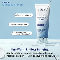 - Experience radiant, healthy-looking skin with Dr. Denese Resurface & Glow Advanced Face Wash, a gentle exfoliating face wash that refines texture and promotes glowing skin. This luxurious cleanser helps lift away impurities, makeup, and excess oil while maintaining the skin’s natural balance. Designed for both men and women, it serves as a daily facial cleanser and exfoliating face scrub that supports smoother, softer, and more hydrated skin. Formulated with gentle exfoliating ingredients like glycolic acid and fruit enzymes, this face exfoliator removes dead skin cells and unclogs pores without stripping moisture. Ideal for dry skin, sensitive skin, and aging skin types, it leaves your complexion refreshed, radiant, and ready for the next steps in your skincare routine. The hydrating face wash doubles as a skin prep for makeup, creating a clean, smooth surface that enhances absorption and finish. This water-based cleanser for face features a blend of hydrating ingredients that soothe and restore your skin’s natural glow. The formula supports brighter tone and texture, helping to refine pores and improve dullness. A non-toxic face wash option for those who value clean skincare, it delivers visible radiance with every use. Use morning and night as part of your daily skincare routine. Massage onto damp skin, then rinse thoroughly. Perfect for those seeking a brightening face wash, gentle cleanser for face, or daily exfoliant that provides hydration and a healthy glow. Dr. Denese skincare combines scientific innovation with proven results, offering a cruelty-free, dermatologist-developed approach to effective facial care.