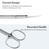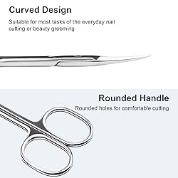 【Manicure Scissors Curved】Manicure scissors have curved blades, which can improve visibility, and can perform specific cutting according to any angle and shape of the target 【Cuticle Scissors Extra Fine】Extra fine cuticle scissors blade meet accurately at the spot for precise and neat cuticle and hangnail trimming; it removes even the smallest of cuticle particles 【Eyebrow Scissor】The eyebrow scissor are made of high-quality stainless steel, which is long-lasting hard steel with incredible cuticle trimming properties., sharp and not easy to rust,eyebrow scissor for trimming and grooming hair of eyebrow, eyelash and nose making better than other eyebrow scissor available in the market 【Multi-Purpose Scissor for Grooming】The round handle small scissors are ergonomic design, it easy to cut manicure, and also ideal as beauty scissors for dry skin , grooming eyebrow, eyelash, beard, even eyelid stickers 【Easy to Clean】Our tijeras para cuticula won't rust, just clean the scissors after each use; wipe with cotton cloth or alcoholic wipes.This scissor can be used for doing haircut of kid, cutting baby toenail, threading eyebrow hair, replacement of tweezers to maintain fringe of the eyebrow and small shear for a lady nurse