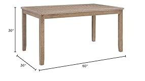 At 60" x 36", the rectangular tabletop provides ample room for up to 6 guests. Ideal for everything from weeknight meals to celebratory spreads. Made from solid acacia wood for lasting durability and a sturdy feel. This dense hardwood resists warping and wear, making it a reliable choice for busy homes. Featuring a hand-applied grey wash glaze over an antiqued wire-brushed texture, this finish subtly accents the woodgrain for a soft, timeworn feel. Enjoy a lightly distressed yet refined vintage look. Gently tapered legs lend to a clean, balanced silhouette that adds a sense of lightness to the overall design. This elegant, subtle touch refines the frame without sacrificing stability. Designed to coordinate seamlessly with a matching bench and side chairs. Create a cohesive dining ensemble with pieces that speak the same design language. Clean lines and neutral tones make this piece easy to layer into a wide range of interiors. A grounded centerpiece for dining spaces both casual and curated, farmhouse and contemporary. The tabletop sits at a classic 30" height, designed to pair seamlessly with dining chairs and benches between 16" and 23" tall. A versatile height that suits most standard seating. Built for stability, the 4-legged base provides excellent balance and support for up to 150 lbs. This durable construction ensures peace of mind, accommodating a wide range of uses while maintaining a sleek, stylish profile. Designed for Residential Use Only: Crafted with the needs of your home in mind, this item is ideal for personal spaces where comfort and style come first. It's not intended for commercial or heavy-duty environments.