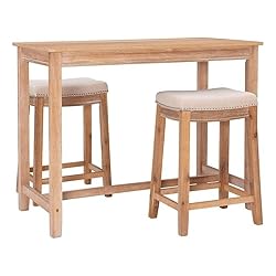 - Bring new warmth and charm to your space with this beautifully crafted 3-piece counter set. The pub table, finished in a glowing natural stain, serves as a sturdy centerpiece, while two matching stools round out the coordinated look. The plush seats in soft beige linen-weave upholstery are lined with silver nailhead trim for a cultivated accent that reaches back generations. Designed with both functionality and style at the forefront, this space-saving set is ideal for kitchen nooks, small dining areas, or cozy apartment living. Whether you're savoring a quiet morning coffee or hosting an intimate gathering, this ensemble sets the stage for effortless dining and everyday comfort. Features: - Crafted from a combination of solid wood and MDF, this set offers lasting strength and stability. It’s built to handle everyday use, making it ideal for high-traffic kitchens, dining areas, or entertainment spaces - Complete 3-Piece Set: Includes a counter-height pub table and 2 matching stools to provide a coordinated, space-saving dining solution. Ideal for compact kitchens, breakfast nooks, and apartment living - A glossy natural stain enhances the rich woodgrain patterns, bringing new warmth and depth to the surface. This luminous finish helps to preserve the wood’s organic beauty for a timeless charm - The cushioned seats are wrapped in a beige linen-weave fabric, offering a muted texture and a soft, comfortable feel. Great for adding an elegant touch to your space while complementing a variety of decor styles - The brushed silver nailhead trim of the stools creates an eye-catching accent that lends a refined, boho charm. This timeless detail is sure to shine in both traditional and modern spaces alike - With its thin 47.25" x 23.75" tabletop, this space-saving set is perfect for smaller rooms and multi-purpose layouts. Its efficient footprint seats 4 comfortably, optimizing seating arrangements without sacrificing style or function - Designed with convenient footrests to reduce strain and increase structural stability, the backless stools ensure a relaxed seating experience. Comfort and support through extended use, guaranteed - Designed to transition effortlessly between meals, work, and social gatherings, this set offers a stylish and functional solution for everyday living. Its durable construction and refined aesthetic make it a go-to choice for a variety of activities - Designed for Residential Use Only: Crafted with the needs of your home in mind, this item is ideal for personal spaces where comfort and style come first. It’s not intended for commercial or heavy-duty environments - This item will ship in multiple cartons. Cartons may arrive separately Specifications: - Assembly Required: Some Assembly Required - Product Dimensions: 47.25"w x 23.75"d x 36"h - Product Weight: 66.15 lbs - Seat Height: 26" - Weight Capacity: Table: 100 lbs, Stools: 275 lbs - Seat Dimensions: 17.25" x 12"