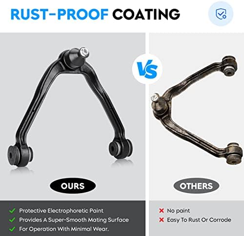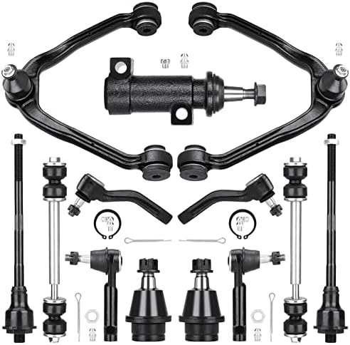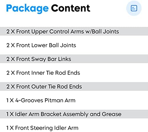 - Kit Includes: 2 X Front Upper Control Arms w/ Ball Joints, 2 X Front Lower Ball Joints, 2 X Front Sway Bar Links, 2 X Front Inner Tie Rod Ends, 2 X Front Outer Tie Rod Ends, 1 X 4-Grooves Pitman Arm, 1 X Idler Arm Bracket Assembly and Grease, 1 X Front Steering Idler Arm