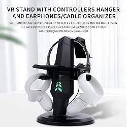 Display Charging Stand for Oculus Quest 2 Headset, and Series such as Rift S/Quest, Valve Index, HP Reverb G2,PSVR 2, Pico 4, any VR products with Type C charging port. The charging time of the VR host is about 3--5 hours. VR Stand with Rotatable Controllers Hanger and Earphones/Cable Organizer. Side hangers are very convenient to place 2 controllers and the hangers on the back provides a place for earphones/cables to meet your higher requirements on organizer LED Charging Indicators with safety secured charging protective chip inside. Protect VR headset lenses. Increased silicon buffer on surface works to prevent the lens from scratched and provides friction so the VR headset won't move and drop easily. no contact with the lenses. No worry about scratching. Rotatable handle holders allow you to easily switch to more different types of controllers. What You Get: 1 VR Stand with Charging Cable for headset and 1*User Manual. If you have any problem with our product, please freely contact us. Kindly be noted that the VR headset and touch controllers are not included!