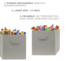 SET OF 4 STORAGE CUBES: Control the clutter with this set of 4 stylish, durable, and sturdy storage cubes. Features strong handles on both sides. Group them together or separately to personalize and arrange your space your way. STRONG AND STURDY ORGANIZING BASKETS: Made with high quality materials, hard sides and bottom inserts. Stash household items, cleaning supplies, sports equipment and toys so they are out of sight but within reach! LARGE SIZE: Measures 13W x 13D x 13H inches. With an open top for easy access, slide the fabric basket bin onto your shelves or cube organizer to store clothing and craft supplies! CONTEMPORARY AND STYLISH IN NEUTRAL COLORS: Our beautiful color selection will enhance your home décor, adding style, character and personality! Display them in your living room, bedroom or kid’s room! COLLAPSIBLE ORGANIZERS WITH 2 REINFORCED HANDLES: Use them when you need them and store them when you don’t! These foldable bins are convenient and functional. Buy today!