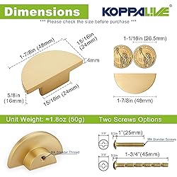 Made of Brass - Strong and durable, not easy to corrode, brushed finish, delicate touch, no fingerprints Modern Design - Suitable for most cabinet styles including kitchen, bedroom, living room, drawer, dresser or updating some old furniture Exquisite Appearance - Simple in shape and exquisite in appearance, it perfectly matches your furniture! Choose Brass Hardware decorate your home! Make cabinet hardware a part of your home decor Product Dimensions - Overall Length 1-7/8" (48mm), Width 15/16" (24mm), Height 5/8" (16mm), Screw Size - 1" Screw and 1-3/4" BreakawayScrew, M4 International Standard Quality After Sales - E-mail us if you have any problem with our gold knobs, and we will reply to you within 24 hours until you are satisfied