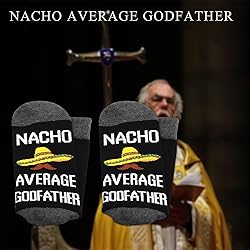 Socks with Godfather Quote: NACHO AVERAGE GODFATHER. This sock is a great gift from a godson and goddaughter to his godfather, as a birthday present or a fun Father's Day Mother's Day gift for Christmas. Quality Material: These Socks Set is made of 80% Cotton, 17% Polyester and 3% Elastane. They will hold up to years of washes and will stay colorful, soft, comfortable, breathable and well fitting! Size: One size fits most men and women, Unisex design fits US sizes 4 to 13. There's no right or wrong way to wear them. Ideal Gifts Choice: They can be the great gift choice for your beloved ones on holidays, like Crazy socks day, Mother's Day, Father’s Day, Anniversary, Valentine's Day, Birthday, Wedding, Christmas etc. Novelty Housewarming gifts or birthday gifts for your wife, husband, girlfriend, boyfriend, bridesmaids, groomsmen, father, mother, grandma or grandpa. Guarantee: If you have any question with the purchase, please feel free to contact us first. We will try our best to solve any problems and provide you with the best customer services.