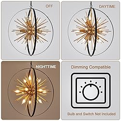 【Stylish Design】The body of the Black and Gold Sputnik Chandelier is wrapped in a spherical shape, like a preserved firework. Every time the lights come on, it's like a small fireworks show sparking up your room. Ideal for living room, kitchen island, dining room, hallway, stairway, entryway, café & restaurant. 【Compatible with Various Bulbs】Sputnik Light Fixture features compatibility with dimmer,12 E12 bulbs base (Switches and Bulbs NOT Included). You can also install LED, Incandescent, or CFL bulbs. The Black and Gold Chandelier will create an enchanting light that illuminates your space with a cozy and warm atmosphere. 【Customized & Adjustable Height】The total height of the Foyer Light Fixtures is 68.51 in, of which the length of the chain is 43.31 in, and the diameter is 23.23 in. Compatible with flat, sloped, and vaulted ceilings, Modern Chandelier can easily customize the height according to your preferences. 【Durable for Use & Easy to Install】Made of high-quality metal and painted with spray paint, the Black and Gold Pendant Light is sturdy and durable and prevents rusting, corroding, or fading. This Chandeliers for Entryway require assembly, detailed installation instructions in the package will guide you on how to complete a quick installation! 【Anything for You】If you have any questions about this Dining Room Light Fixture, please feel free to contact us. We want to provide you with a satisfying shopping experience.