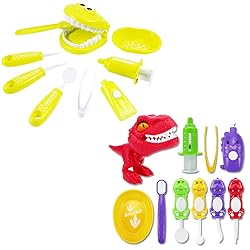 【9+10 PCS Pretend Dental Kit】Forceps, Syringe, Toothbrush, Toothpaste, Plate, Oral Mirror, Toothbrush, Denture, Dental Burs + Dinosaur 【Dental Health Education】Though this set has only 9PCS, quite simple design compared with other toys in the same category, its simplicity actually has advantages if you look from another angle. Instead of being overwhelmed by dozens of dental tools, children can be quick to grasp the fuction of these 9PCS, which is far enough to cultivate their habit of dental health. 【Overcome Fear to See a Dentist】For parents, children fear to see a dentist is quite common. This set is a good tool for parents to show their children how a dentist works and improves their dental health, a good preparation. 【Simple packaging & Inexpensive】Simple packaging enables it to be lower in price. As a tool to cultivate children's habit, once it achieves the goal, it is worth the money. 【Safe】Uses nontoxic materials, safety test approved