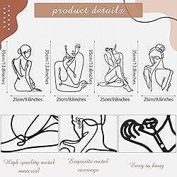 Minimalist Abstract Woman Wall Art Set: you will get 4 pieces of women sculpture arts, a nice combination can meet your decoration needs easily, also nice for sharing with others Dependable to Serve You: made of quality metal material, the minimalist wall art is well polished and smooth in surface, not easy to break or deform, the solid color is not easy to fade, neat appearance with nice coated finish and sleek curves, which can meet your long term decoration needs Easy to Draw People: each black metal wall decor measures about 35 x 25 cm/ 14 x 10 inches, the right size can be easily noticed by your guests from a certain distance, draw people's attention at a glance, show your nice aesthetic taste Broadly Applicable: nice in appearance, our modern metal wall art decor can go well with a variety of home styles, suitable for you to use for many places, such as your bedroom, living room, porch, restaurant, bathroom, hotel, meeting room and more, which can well fit its surroundings, create a relaxing atmosphere Simple to Use: designed with holes at the back, the metal line art wall decor can be easily hung on the wall with nails or ropes (not included) at will, easy to install or remove, saving your time and energy