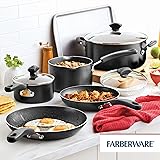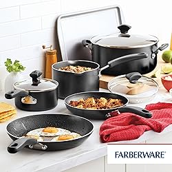 - Equip the kitchen for convenience and reliability to make great family meals with the Farberware Cookstart 15-Piece DiamondMax™ Nonstick Cookware Set. Farberware has brought performance, convenience and reliability to countless kitchens for over 100 years, and this set continues that tradition for a new generation. Crafted from heavy-duty aluminum for excellent heat distribution, this nonstick cookware boasts modern exteriors and superior DiamondMax™ nonstick interiors that perform 3X better than ceramic nonstick for easy food release and cleanup with a distinctive look. Use the saucepans for warming soups and sauces, the skillets for browning ground beef or pork chops, and the cookie pan for roasting chicken nuggets or baking up a batch of chocolate chunk cookies. The pots and pans are oven safe to 350°F and feature comfortable handles for a confident grip. Shatter-resistant glass lids allow cooking to be monitored without losing heat or moisture, and the set includes six handy Prestige® nylon kitchen tools to get delicious dishes started right away. Plus, the entire set is dishwasher safe for quick, convenient cleanup. Be ready to create breakfast, lunch, and dinner every day with the convenient, essential pieces in the Farberware Cookstart 15-Piece DiamondMax™ Nonstick Cookware Set.
