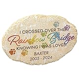 - Made just for your friend who crossed over the Rainbow Bridge, this Personalized Oval Rainbow Bridge Pet Memorial Garden Stone confirms your love went along with ... in his or her heart. Printed with the assurance "I crossed over the Rainbow Bridge knowing I was loved", the pet memorial garden stepping stone is crafted of textured 100% resin, detailed with little paw prints, and finished with a hook on back so it doubles as a wall plaque. We'll personalize with any pet's name and life dates, creating a comforting keepsake for you, or a thoughtful gift for a grieving friend. Specify name; limit 1 line, 18 letters/spaces. Specify dates; limit 1 line, 18 characters/spaces. Durably designed for indoor/outdoor use, the oval-shaped outdoor decor can be placed outdoors as a stepping stone, and includes a hook on back for hanging display as a plaque. This heartfelt yard art and memorial stone measures 11 1/2" long x 8" wide. We recommend bringing this personalized memorial garden stone inside during cold, snowy months. Please note: At this time, we are only able to personalize characters from the English keyboard.