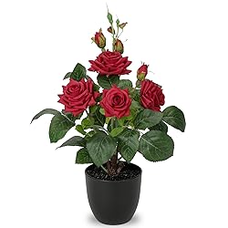Hollyone Artificial Plants & Flowers in Vase Red Roses Artificial Flowers Potted Plant Faux Silk Flower with Black Pot Fake Rose Flower Arrangement Home Decor Bathroom Shelf Desk Decoration 15 Inch