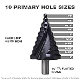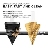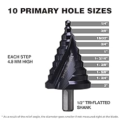 [M2 HSS]: Cuts A LOT MORE CLEAN holes and much EASIER than average step bits. In general, M2 has 50% more Tungsten and 150% more Molybdenum, both of which are key elements in improving durability. Our additional Vacuum heat treatment and Nitride surface hardening treatment make the performance even better. [Non-stop]: Our Polished Steps and Size Highlights let you able to see target hole size during drilling. No need to stop in the middle of the drilling and check. Save you time and hassle. [Easier | Faster | Cleaner]: With our high-accuracy CNC processing and several optimized design details over the years, our design cuts EASY, FAST and CLEAN, outperforming the average ones on the market. [Heavy duty]: Cuts holes on Stainless steel (need appropriate pressure), Hardened Metal, Mild steel, Galvanized steel, Aluminum, Copper, Plastic, Wood, or anything that has similar or lower hardness as these materials. Up to 12ga /2.7mm thickness for Stainless steel. [Multi Hole Sizes]: No need to buy a kit. This one step bit comes with 10 marked sizes so you can drill 10 different hole sizes, saving you time and efforts to change bits. Marked sizes including: 1/4", 3/8", 19/32", 3/4", 1", 1-3/16", 1-3/8", 1-5/8", 1-3/4", 2".