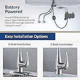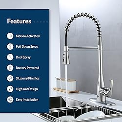 Hands-free motion sensor turns the water on and off with the wave of a hand Spring neck design with dual function head offers spray and stream patterns Retractable pull-down sprayer with smooth glide nylon hose High arc design available in two luxurious, easy clean finishes and motion activated functionality Easy DIY install with no hard wiring, battery powered, single- or three-hole options
