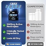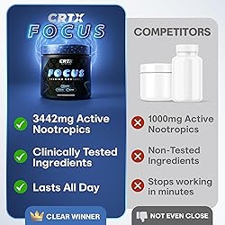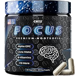 BOOST COGNITIVE POWER: CRTX Nutrition Focus is the only focus supplement that can boost brain energy and enhance cognitive function, an excellent choice for busy professionals and students. This cognitive supplement can enhance productivity, memory and overall brain boost to feel like a genius. Make this nootropic a part of your studying essentials ULTIMATE BRAIN SUPPLEMENT STACK: Our power-packed CAFFEINE FREE brain booster supplement contains trademarked GeniusPure Alpha-GPC, RhodioPrime Rhodiola Rosea, 10:1 Lion's Mane, L-Tyrosine, Bacopa Monnieri, 10:1 Cordyceps, Vitamin B and L-Theanine plus other adaptogens, dopamine supplements and brain vitamins, making this the best brain focus and memory supplements. All at optimal doses for maximum effectiveness there is no question CRTX is the best memory supplement for brain. CLINICALLY DOSED AND TRANSPARENT: You found the #1 nootropics brain support supplement, CRTX Focus is formulated with powerful compounds and clinically backed doses for optimal effectiveness. Boost mental performance, stay sharp and focused as you grind towards your goals, and unlock your full potential with our dynamic blend. Comprehensive support for cognitive function and a higher level of consciousness, no prescription needed. POWER YOUR CORTEX: Do you want THE BEST brain supplements for memory and focus? You found it. CRTX Focus is a brain health supplements for adults, and for anyone who cares about their cognitive function. Take these choline supplements memory pills to eliminate the brain fog and make your brain ageless. This is the premium memory and focus supplements giving you a youthful brain. USA GMP CERTIFIED & TESTED: CRTX Nutrition Focus supplement is a premium nootropic brain vitamins, carefully crafted with the highest-quality ingredients and manufactured in a GMP certified facility in the USA. You can trust that our focus pills is safe, legal, and effective, and that we're committed to providing you with a high-quality neuro health memory supplement for brain that you can feel confident taking.