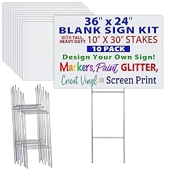- Blank Customizable Yard Sign include white blank 36x24 inch corrugated plastic yard signs - These do not come with yard stakes. Perfect for DIY projects, crafts, cri cut and silhouette vinyl projects, birthday party, yard sale, directional signage and more. Let your creativity flow! High Quality, All-Weather Lawn Sign made from durable 4mm coroplast (corrugated plastic cardboard). Our waterproof and wind resistant signs can handle the weather! Great for Garage Sales, Graduation Parties, welcome home, congratulations, birthday, gender reveal, homecoming, parades, window signs for home or business, decorations, holiday display, directional signage, election, parade, family or high school reunion and more. If you need to make a sign these will not disappoint! Size - Signs are 36” wide x 24” Tall and 4mm thick. And they are Made In The USA!! Be creative - our blank durable and waterproof sign boards can be used for so many things besides signage. Take inspiration from our many customers and some of their uses: chicken coop roof; cage liners for birds, hamsters, ferrets and guinea pigs; privacy barrier on balcony; backing for acoustic panels; feral cat house roof overhang; create unique gift boxes; paper target backing; build a playhouse big enough for kids or for their baby dolls; and the list goes on. Versatile - Perfect for crafts, vinyl projects, birthday party, yard, garage or estate sale, directional signage, election, parade, family or high school reunion and more. If you need to make a sign these will not disappoint!