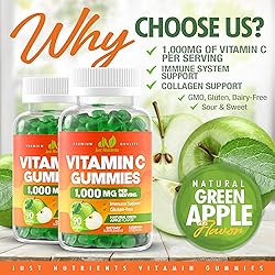 1,000 Mg of Vitamin C Per Serving - Just 3 gummies give you up to 8 times the Vitamin C as other gummy brands providing your body with a power dose of Vitamin C for your immune system. Delicious Sour Green Apple Flavor - Sprinkled with sugar, enjoy our tart and sweet green apple flavored gummies that you will look forward to taking. Natural Ingredients - Packed full of natural ingredients and contains No GMOs, No Gluten, No Soy, No Dairy, No Artificial Colors or Preservatives and is 100% Vegetarian. Vitamin C for the Entire Family - Our maximum strength Vitamin C gummies are a great way for the whole family to get their daily dose of Vitamin C. 90 Gummies Per Bottle - At 3 gummies per serving, get a full 30 days supply in just one bottle or 90 days of 333mg.