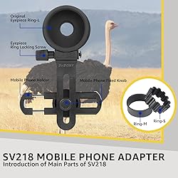 Easily capture the world in your lens; SV218 Smartphone Adapter can connect your phone to the telescope; spotting scope; monocular; microscope; capture wonderful images and videos to share with friends and family Compatible with eyepieces of different calibers; has 2 sizes of rubber rings;which can fit eyepieces with an outer diameter of 26mm-49.3mm; fits most 1.25-inch eyepieces Compatible with different brands of smartphones; SV218 universal mobile phone adapter is suitable for mobile phones with a width of 62mm-105mm; compatible with iPhone; Samsung; Huawei; Sony; LG and other brands of mobile phones Easy to operate and use; just put your mobile phone in the adapter; align the main camera of your mobile phone with the eyepiece hole; then fix the mobile phone adapter on the eyepiece; you can easily capture images and videos Long handle design; allows users to adjust the position of the mobile phone adapter; easily avoid the side buttons of the mobile phone