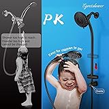 EASY TOOL-FREE CONNECTION - No plumber needed, no tools required, mounts instantly, no drilling or wall damage! We have clear, step-by-step instructions with pictures to guide you through the 5-minute installation.27.5" stainless steel drill-free bar with adjustable slider, 5 ft flexible stainless steel shower hose with 2 brass nuts, washers, teflon tape, installation mannual & warranty included, fits any standard shower arm. 5 FUNCTION MODERN LARGE SPRAY FACE SHOWER HEAD - Features large 5" face, high-power click lever dial & angle-adjustable innovative design, 5 setting include Rain / Massage / Rain & Massage / Bubbling Massage /Rain & Bubbling Massage, Full Polished Chrome (including back and face). DURABLE MATERIAL - The shower head with handheld is constructed from brushed nickel plated ABS material which is non-toxic, durable and lightweight. The adjustable swivel ball joint and stainless steel hose give you a larger shower area. ANTI-CLOGGING NOZZLES - Don't have to suffer from two shower head with clogged nozzles or spraying in wrong direction. With unique self-cleaning nozzles which are made from mineral- resistant silicone, and resistant to lime and mineral deposits, calcium and mineral deposits can be easily removed by rubbing the nozzle back and forth with water on. SHOWERHEAD ERPERTISE WARRANTY - Shop with confidence knowing that all shower heads are backed showerhead expertise. In case your purchase doesn't meet your expectations, please let us know and we'll make it right. All we care is to let you have a nice, comfortable, relaxing shower all the time.